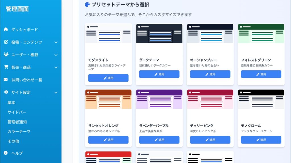 ページの上半分には、プリセットのカラーテーマが一覧で表示されます。