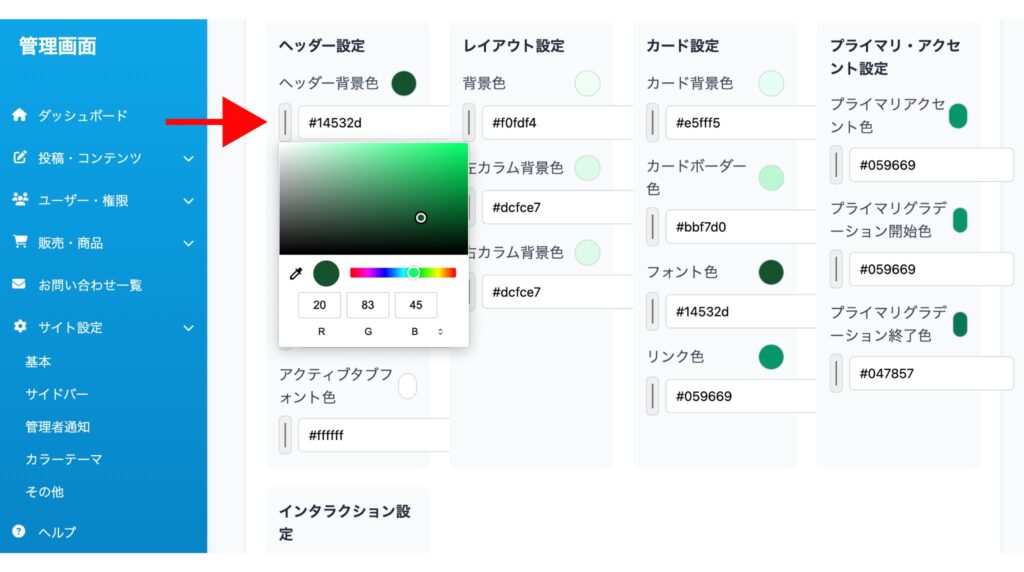画面左側のメニューから「サイト設定」をクリックし、その中にある「カラーテーマ」を開いてください。