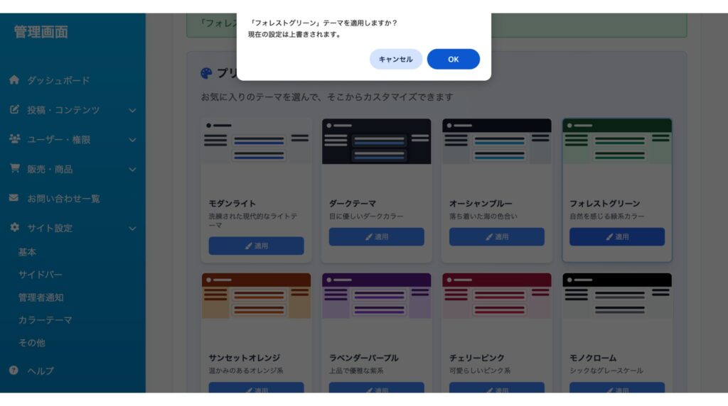 好みのカラーテーマを選んで「選択する」をクリックすると、確認のアラートが表示されます。